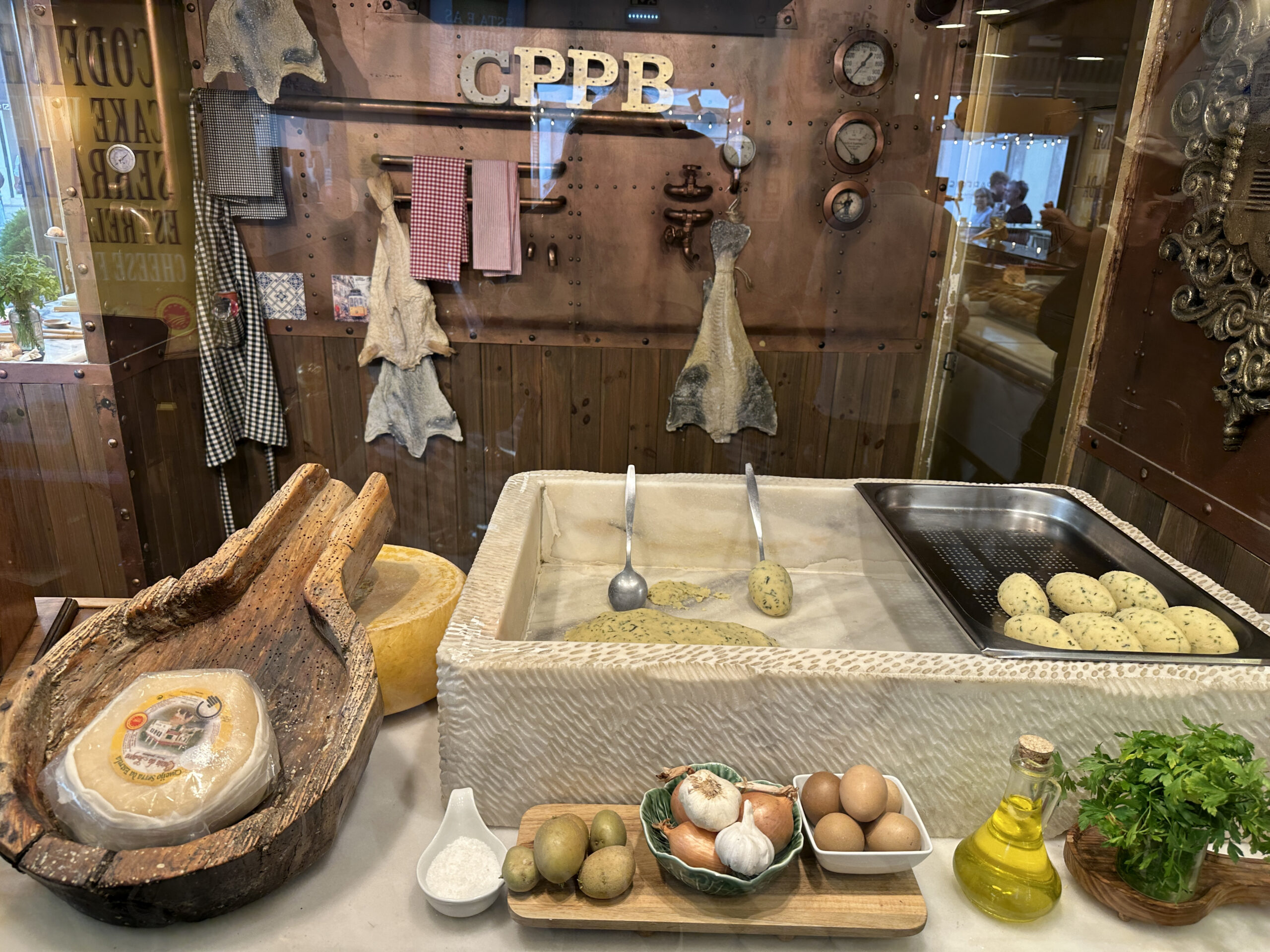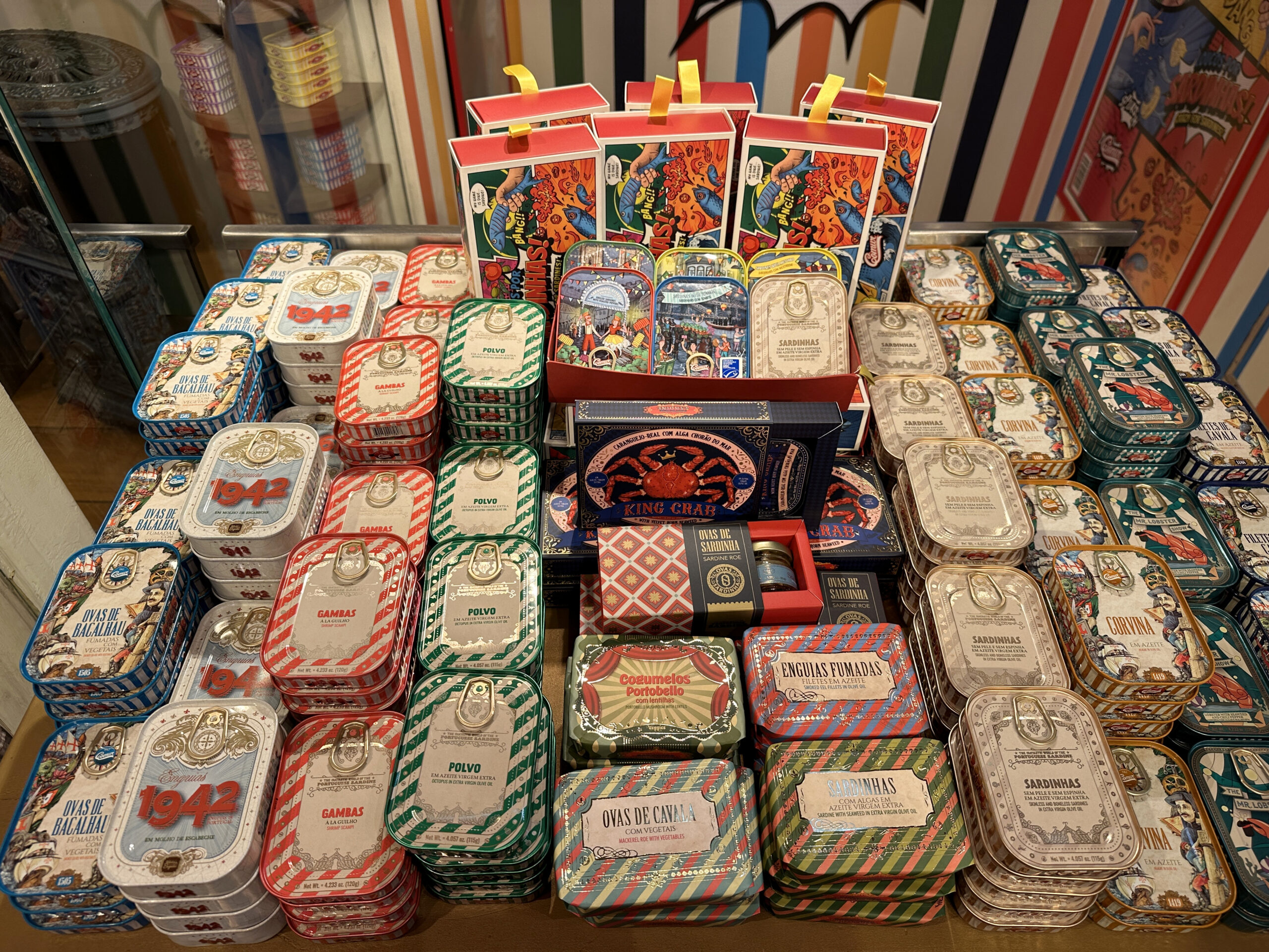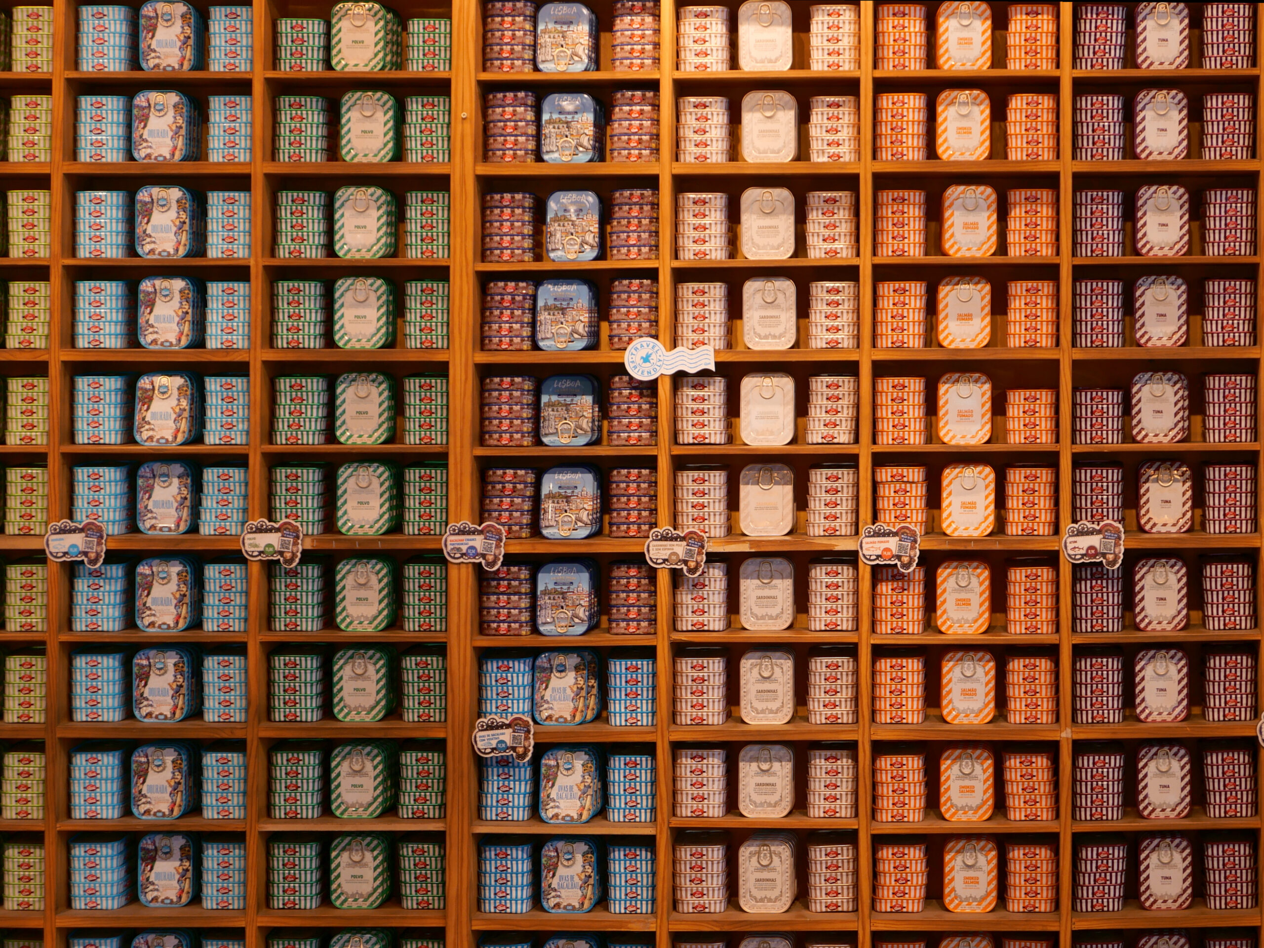 Zdjęcie puszek z sardynkami z sardynkowego sklepu. Każda inna, a drogie tak, że lepiej zrobić fotkę niż kupować. Za mniej niż 5 euro za maleńką puszkę nic się nie kupi, złota – ze 20 euro. Ale miło popatrzeć na wystawę.
