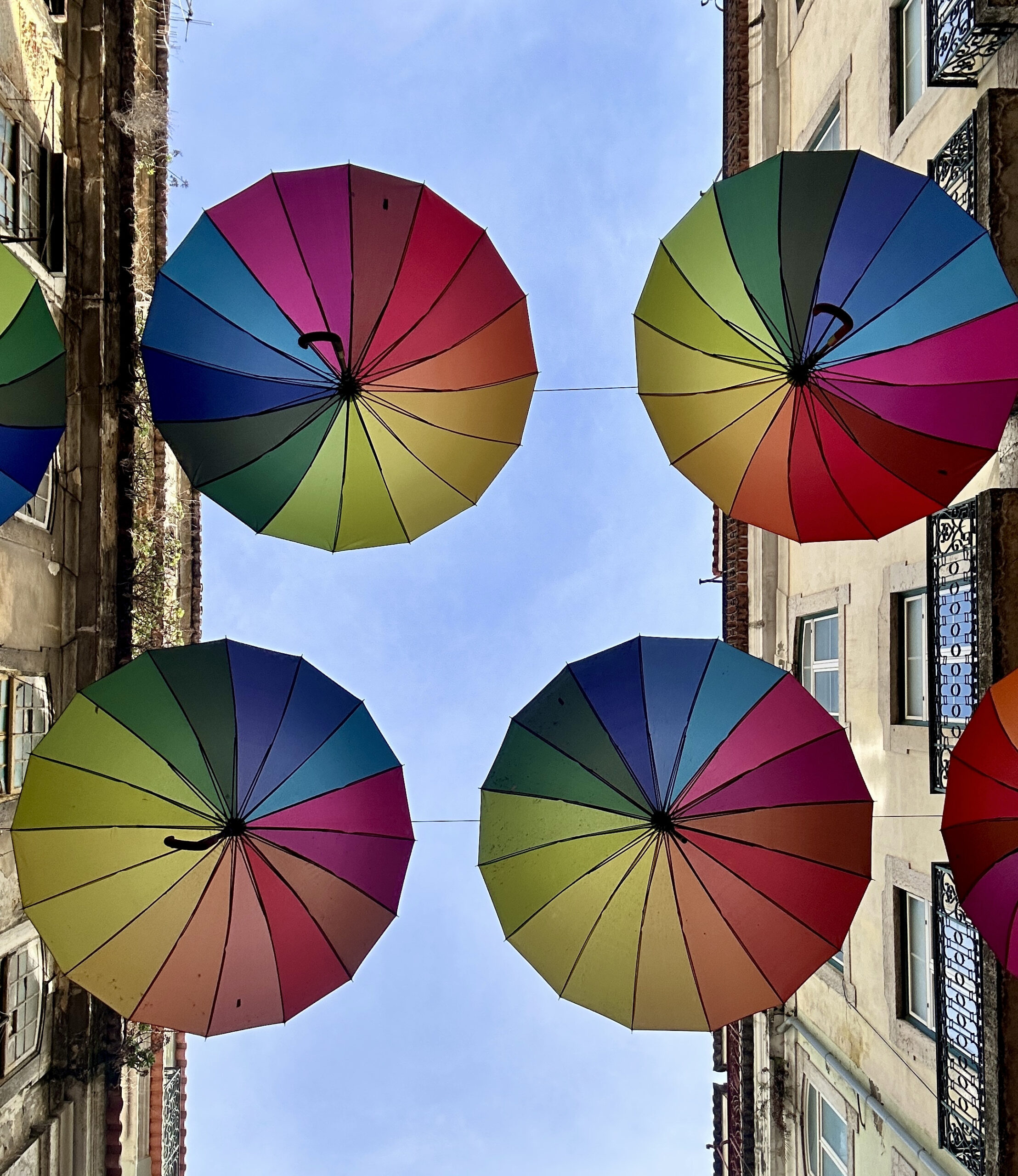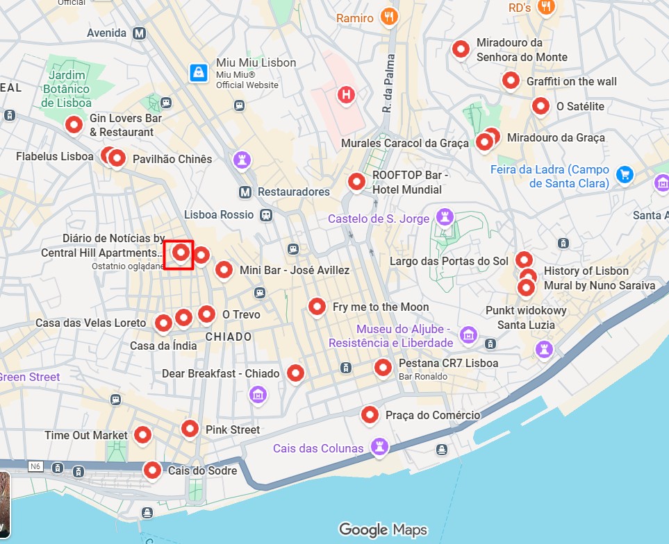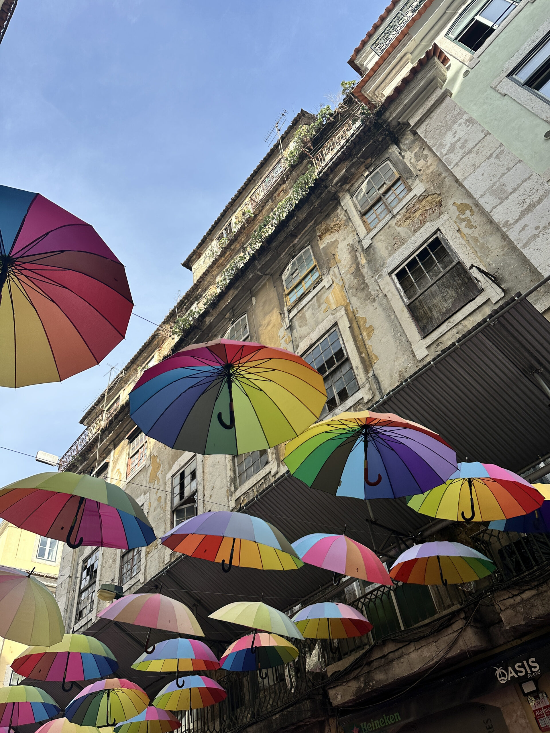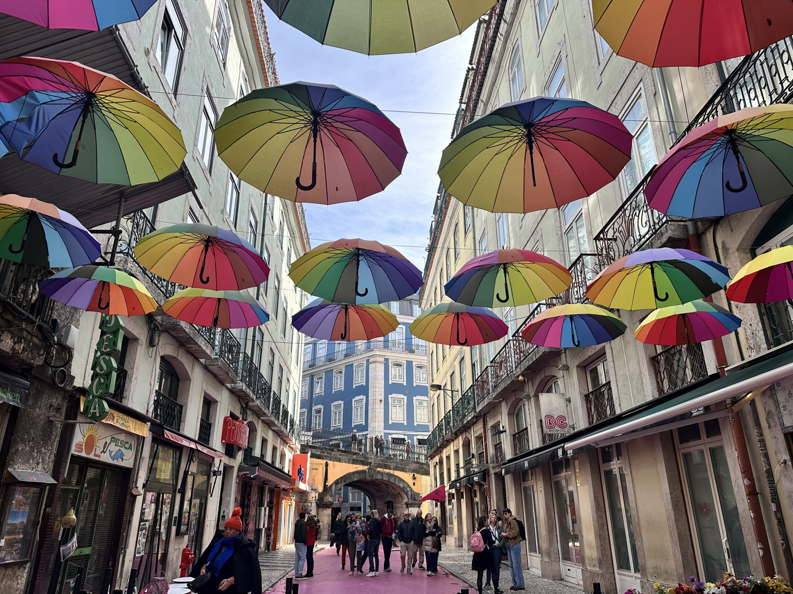 Pink Street – malutka uliczka z wiszącymi nad nią tęczowymi parasolami i różowym chodnikiem. Nocą imprezownia, w ciągu dnia pustawo, ale parasole przyjemnie się fotografuje. Stąd już bardzo blisko do dworca Cais de Sodre i na plażę.