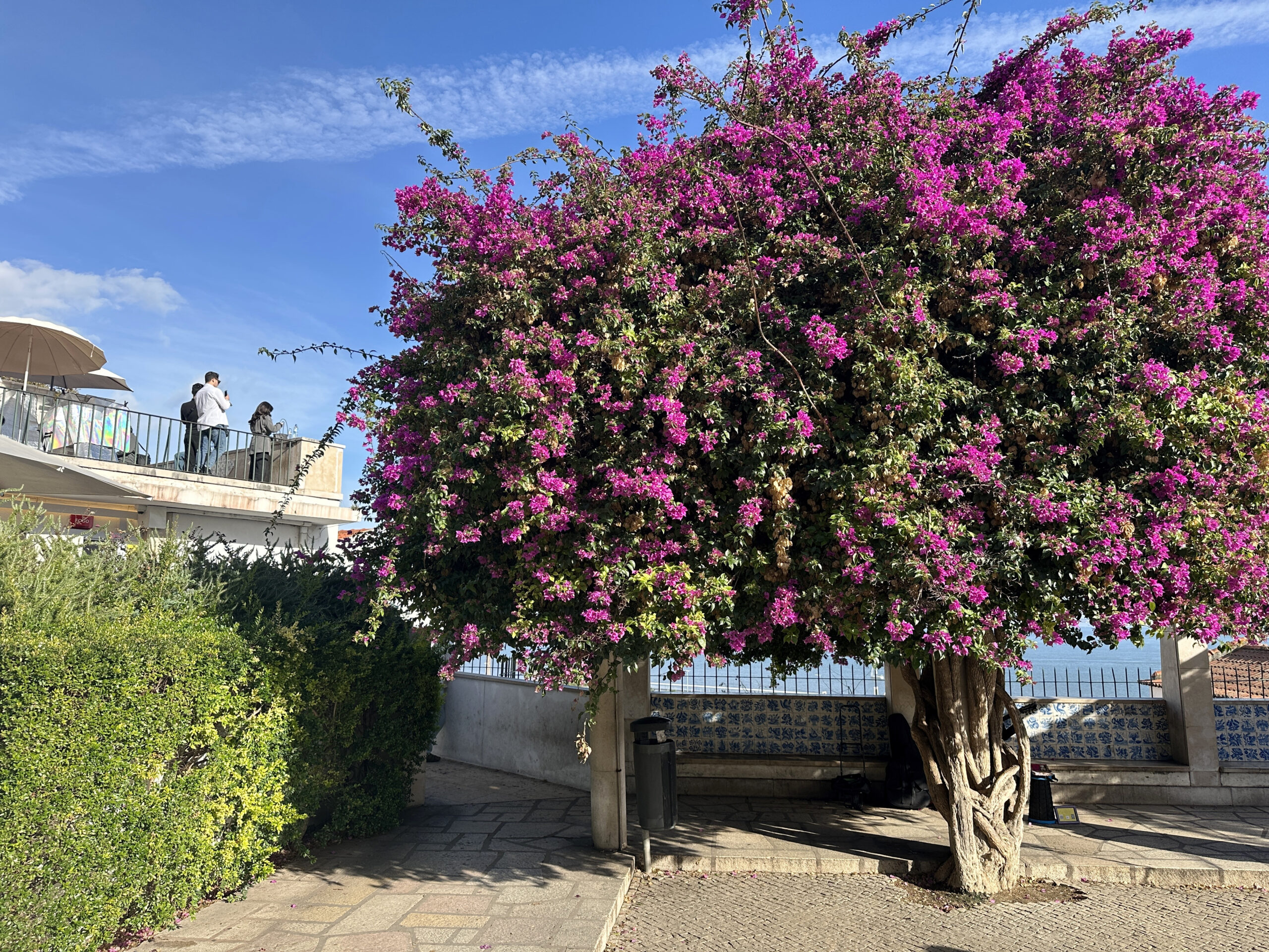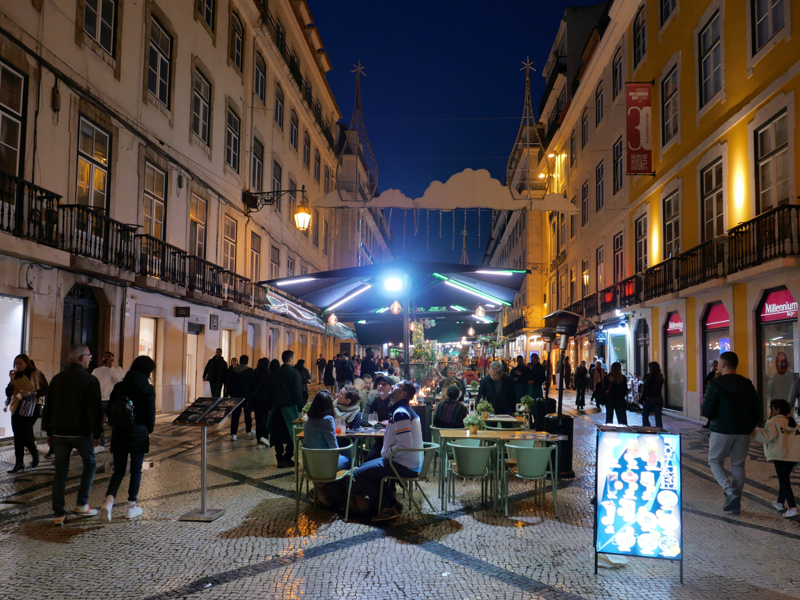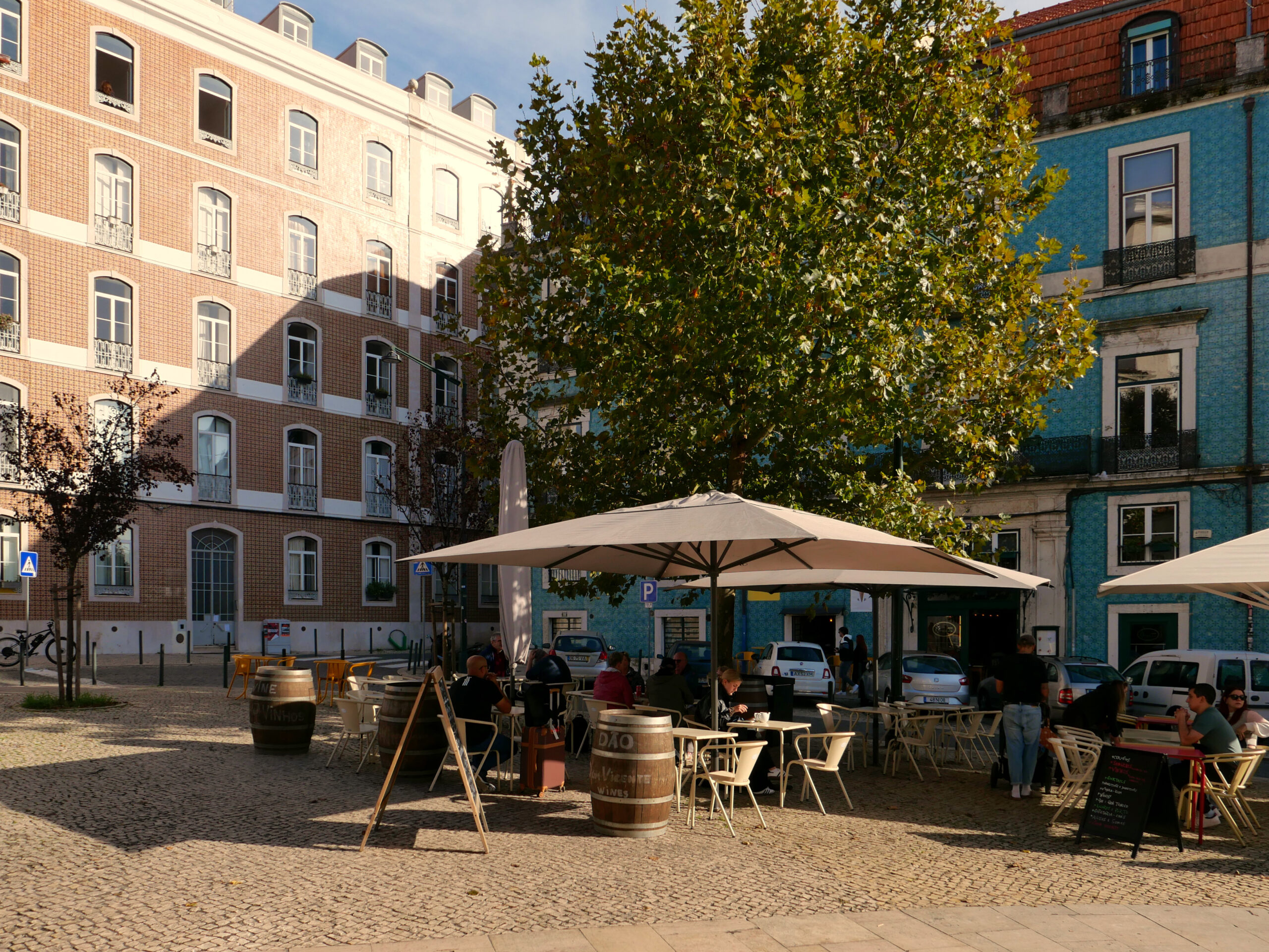 Pink Street – malutka uliczka z wiszącymi nad nią tęczowymi parasolami i różowym chodnikiem. Nocą imprezownia, w ciągu dnia pustawo, ale parasole przyjemnie się fotografuje. Stąd już bardzo blisko do dworca Cais de Sodre i na plażę.